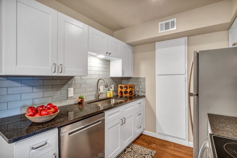 These beautifully renovated apartments feature stainless steel appliances, white shaker cabinets, granite countertops, a stylish tile backsplash, and a modern undermount sink with a pulldown faucet. Additional upgrades include woodstyle plank flooring, crown molding, updated lighting, ceiling fans, and contemporary bathroom vanities.
