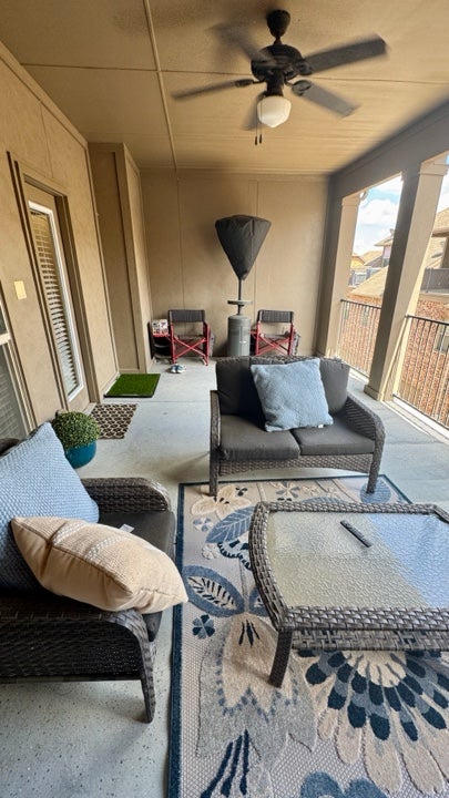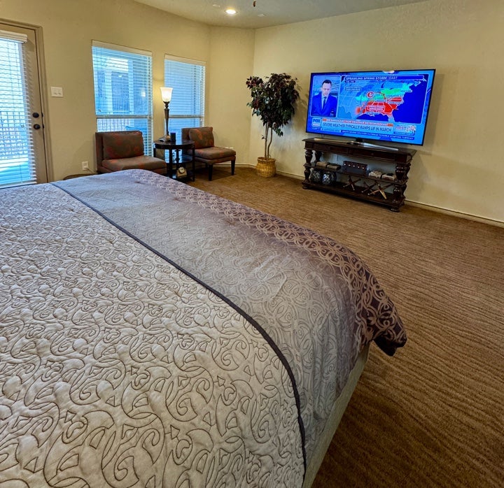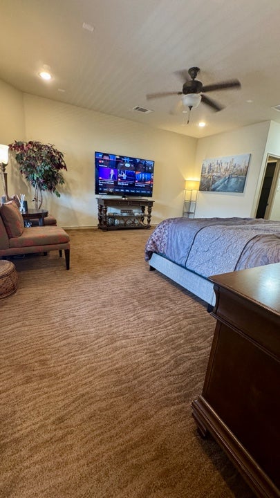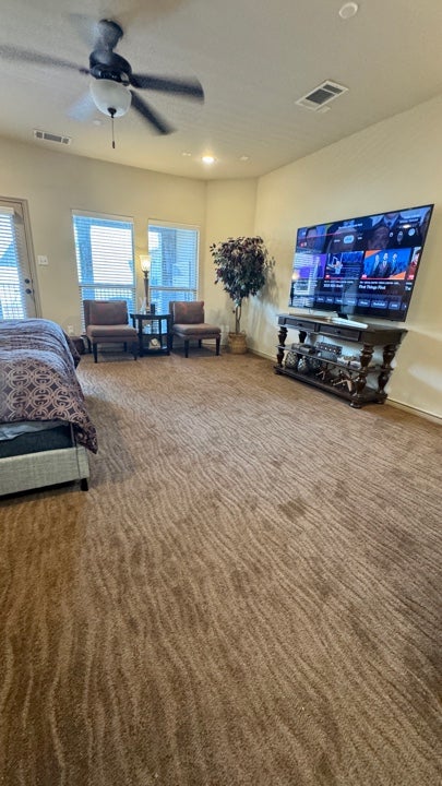 β¨ Your Space / 3rd FL (All Private): β’ Huge 18β x 18β (319 SqFt) primary bedroom with 75β TV β’ Private en-suite bathroom β’ Walk-in closet β’ Large covered walk-out balcony (approx. 12x 18β) with seating + 55β smart TV on patio. β’ Fully furnished: King bed, nightstands, chairs, 75β smart TV * Patio/balcony is exclusively yours β not shared