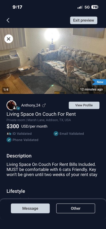 $300 Rent with Bills Included For Couch In The Living Room Space Deposit $25 Must be comfortable with 6 cats Key Won’t Be Given Until Two Weeks From Your Stay I Can Do Weekly Stay to Monthly If You Call Me Or Try to Contact Me Please Send A Message