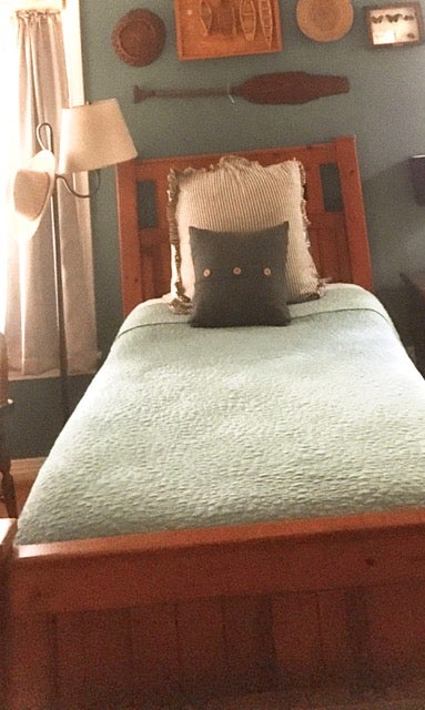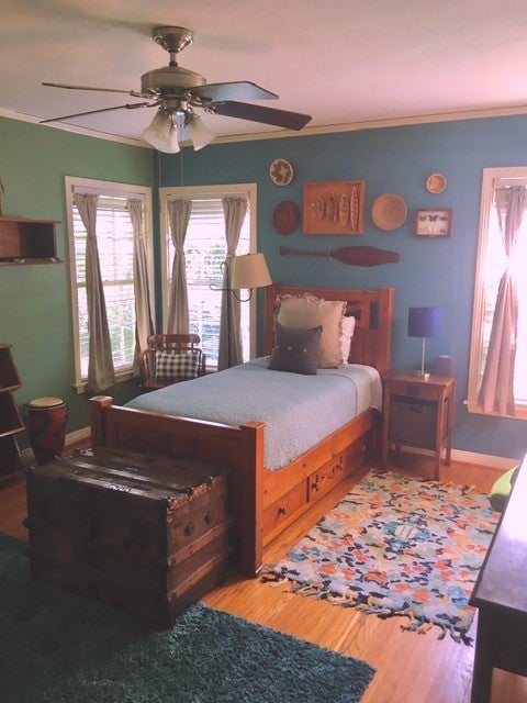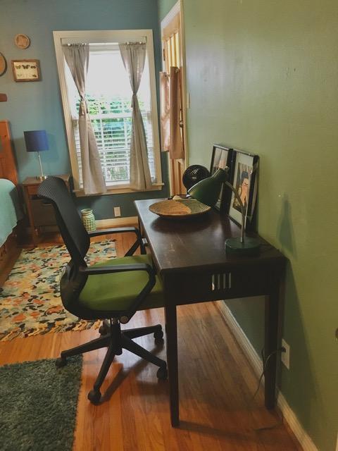 Very clean, well decorated, fully furnished house. Room has bed, farm washstand, English linen chest armoire, desk, office chair. Direct access to the front porch. Great place to work remotely, study, get ahead, chill.