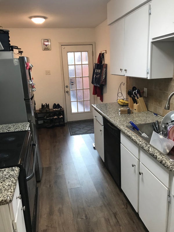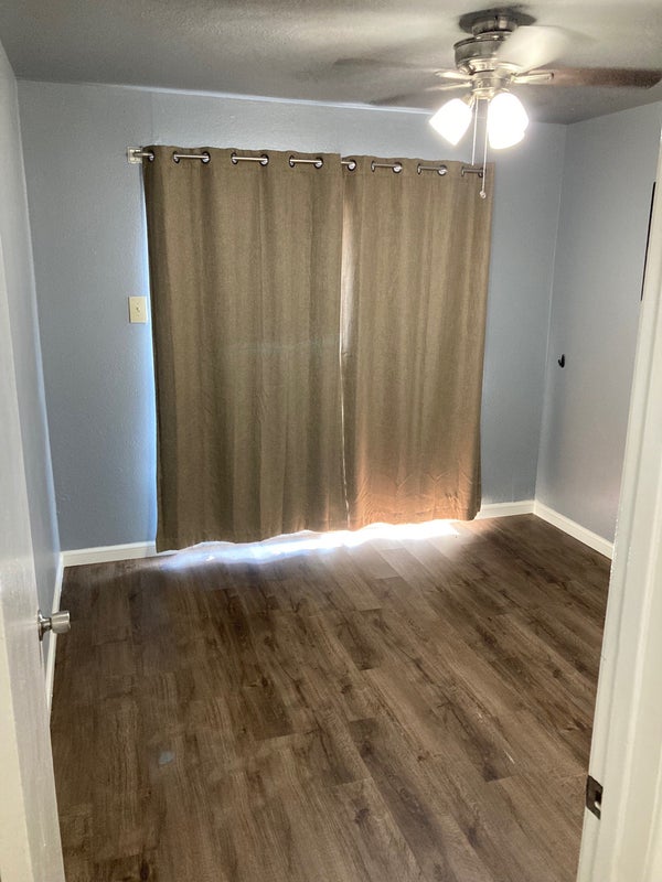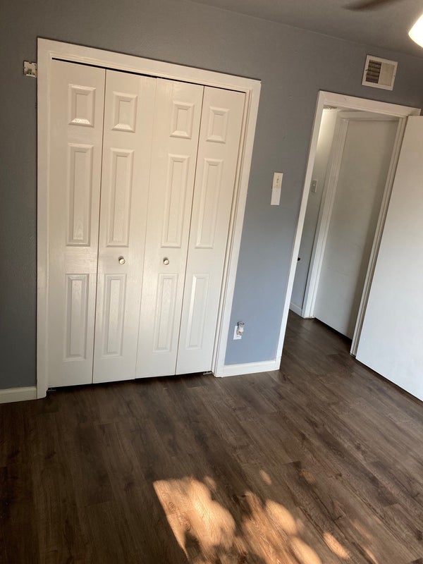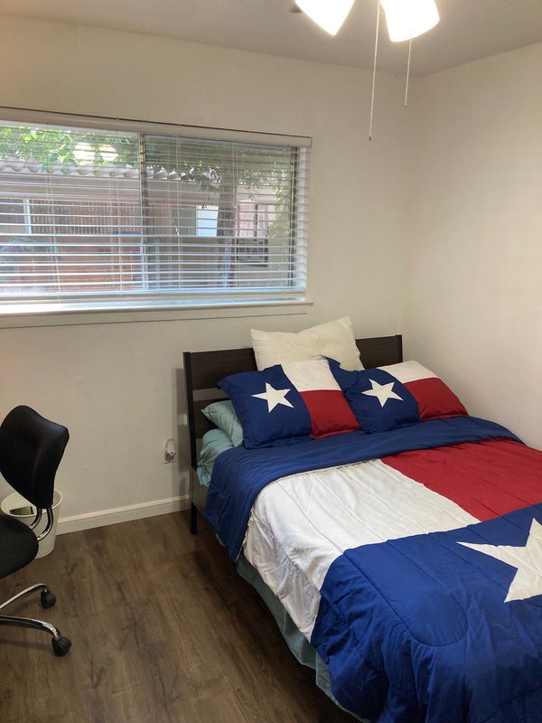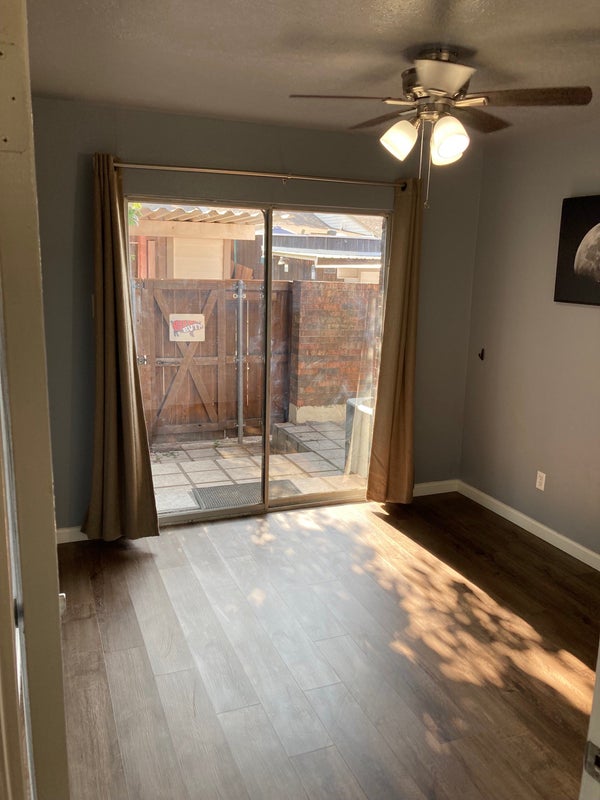 Both rooms face the patio and alleyway, where your vehicles will be parked. The unfurnished room has a sliding door that leads straight to the patio, where smoking is allowed. Washer and dryer in home. Common areas include kitchen and living room.