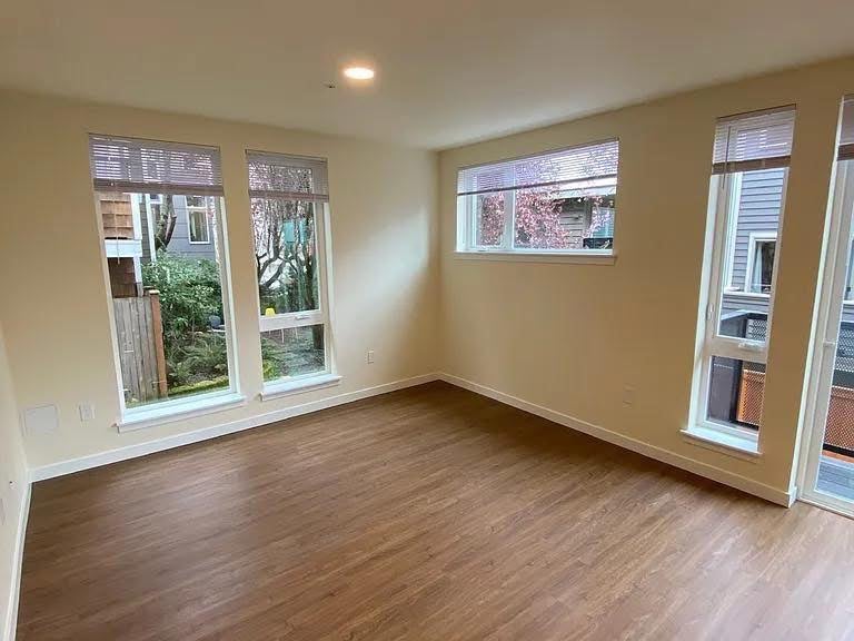 The unit features a bright living area, two spacious bedrooms with good closet space, a clean bathroom, and a functional kitchen with cabinets and essential appliances. Large windows bring in plenty of natural light, creating a warm and welcoming atmosphere.