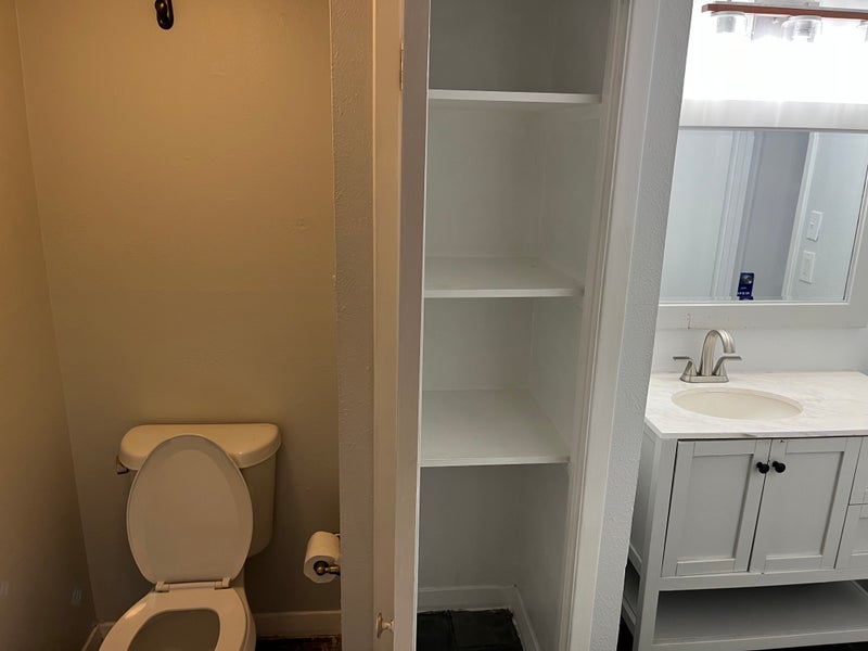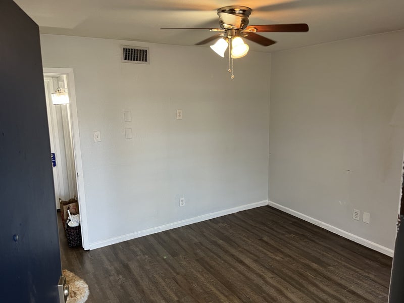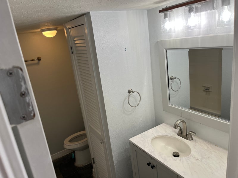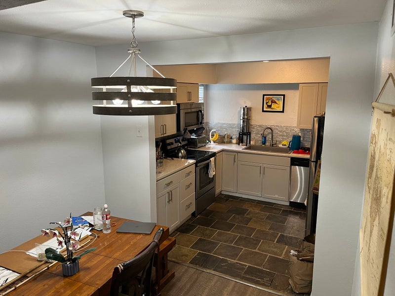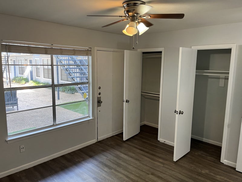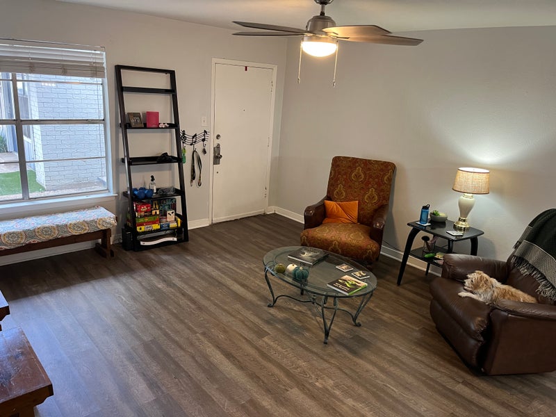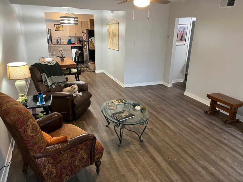 The whole apartment has 2 bedrooms and 2 baths. The kitchen, dining, and living room are one long room. Neighborhood is very walkable. Small apartment complex where residents know and recognize each other. Ground floor. Carport available for $35.