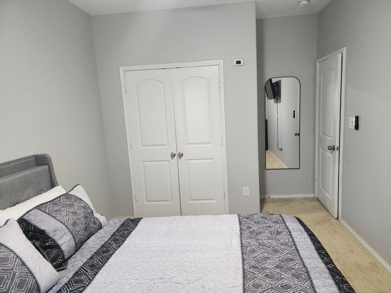 Furnished room with Queen bed, dresser, TV, full length mirror with with shared bathroom.