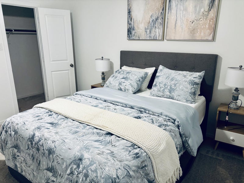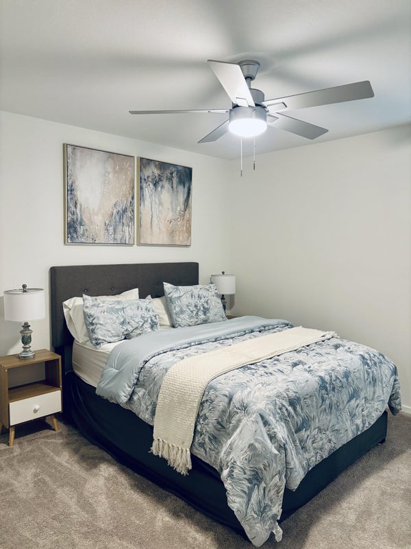 This private bedroom is located on the second floor of a well-maintained home and offers a comfortable, thoughtfully furnished space designed for renters. The room includes a queen-size bed, a ceiling fan, a full-length mirror, nightstands with lamps, and a closet for storage. Being upstairs, the room provides added privacy and separation from the main living areas.