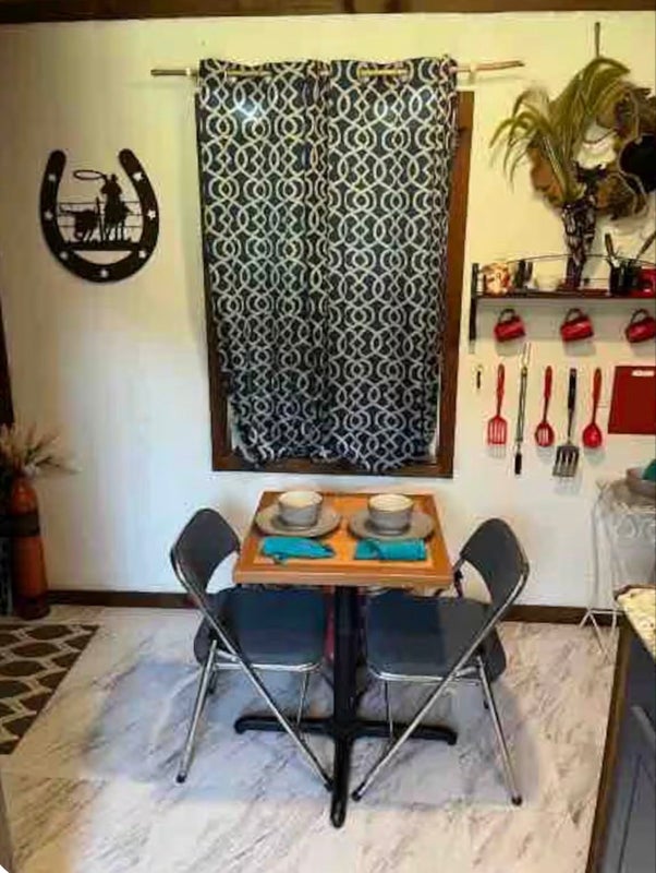 This unique Cabin has full bath Washer and dryer separate building , campfire pit. Kitchenette, Dog friendly with huge dog park ! Sleeps twin beds, trundle bed . Fridge , microwave ,kitchenette , Electric , sewer , WiFi , water & trash included