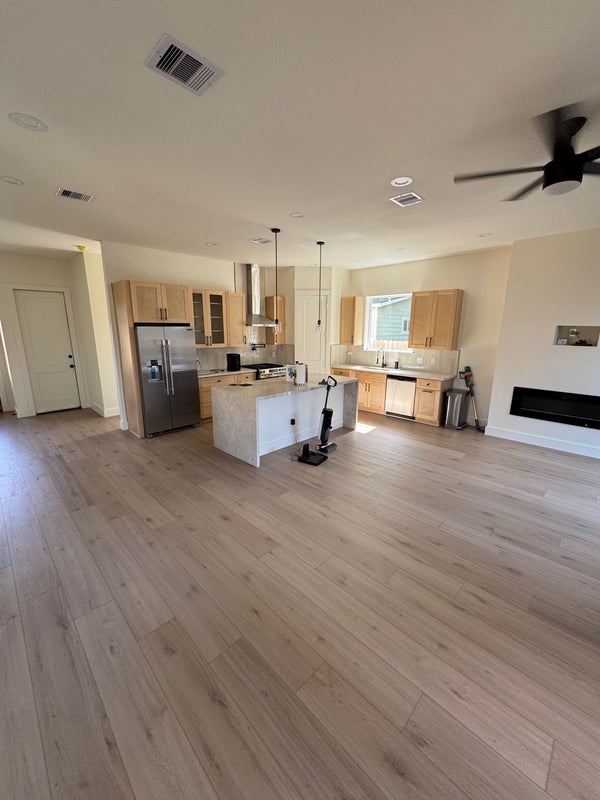 This is a new build home, with very large driveway and yard. The living areas are furnished (living room and kitchen) The room being rented is a large 15x15 room with a very good sz walk in closet, it also has its own private restroom.