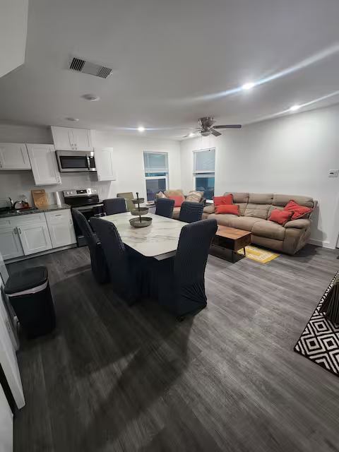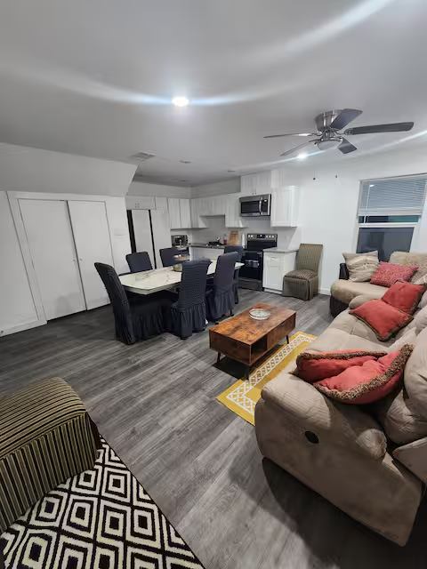 ROOM RENTAL FEATURES: * All utilities INCLUDED!!! (Electricity, water, internet, etc.) * Each bedroom is furnished with a kingsize bed and nightstands. * Each room has their own privately assigned bathroom. Only the regular bedrooms share a standing glass shower, but each room has their own assigned bathroom sink and toilet. * Weekly rent must be paid in full by each Saturday at am or the renter must move out within hours. * The home features top of the line amenities such as a washer and dryer, a reclining sofa, a spinning circle couch, a large dining room table, a television, a highend refrigerator, kitchen supplies, codecontrolled entrance door, fingerprintcontrolled bedroom door, video surveillance of common areas, a backyard sitting area, and free driveway & street parking on a deadend street! Centrally located. Only neighbor.