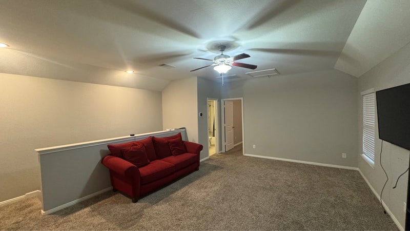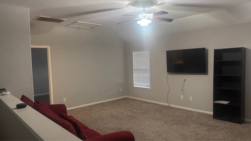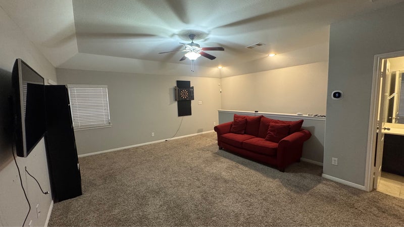The area for rent is located upstairs, and includes the bedroom, a full bathroom, and the game-room. The bedroom is unfurnished, so you can bring your own furniture!
