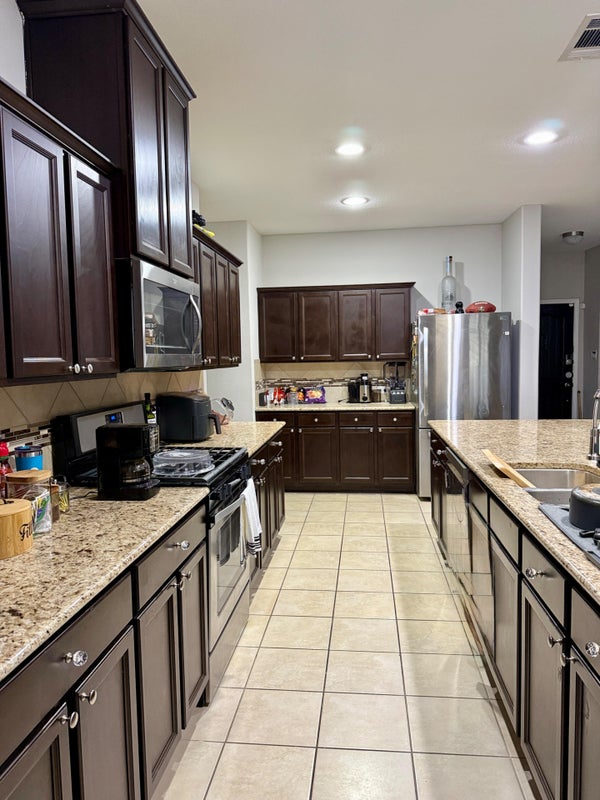 The kitchen is equipped with a two refrigerators, sink, gas oven and stovetop, as well as a garbage disposal. The granite countertops and wide range of appliances air fryer, food processor, smoothie maker make it the perfect spot for you to cook at home and save money. Just clean up as you go and leave the space ready for the next person when you’re done!