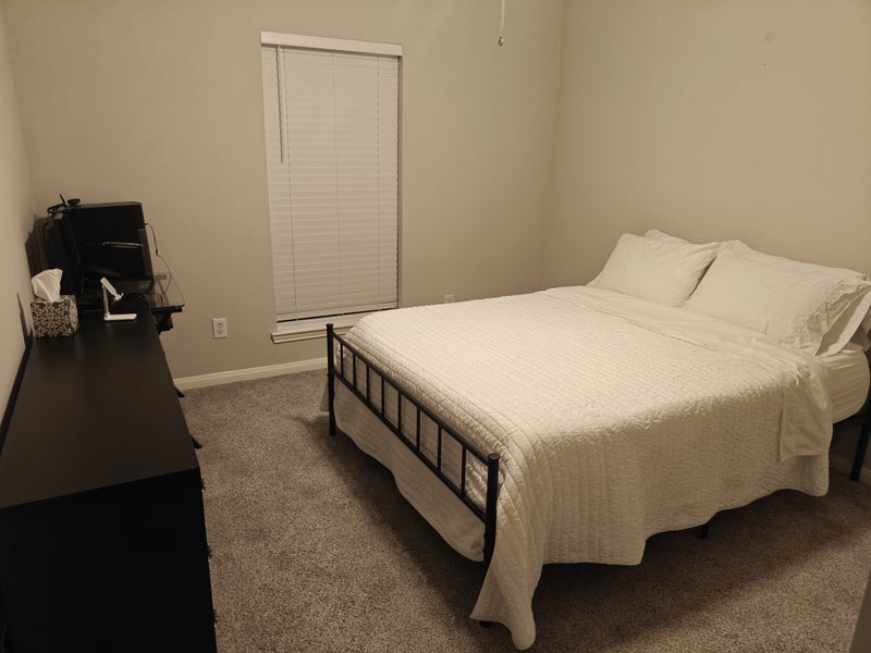 Queen bed and dresser in a large room with closet, full hall bath, and access to living and kitchen. 2 car garage, W/D on site, fiber Wi-Fi internet.