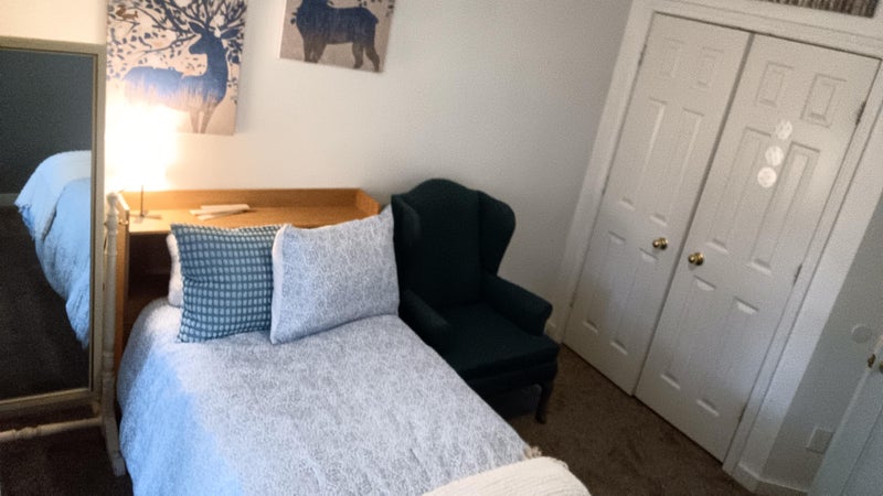The rear of the house has three bedrooms, each outfitted with twin beds and some furniture. Each bed comes with two sets of linens. The kitchen and back living room are common areas. There is a cleaning schedule for the bathroom, kitchen, living room/hall.