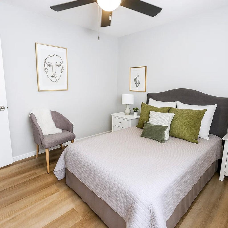 Furnishings: Fully furnished with a plush queensized bed, highquality linens, a nightstand with a lamp, a spacious wardrobe for storage, and a cozy armchair for reading or unwinding. A small desk is also included, making it ideal for remote work or study.