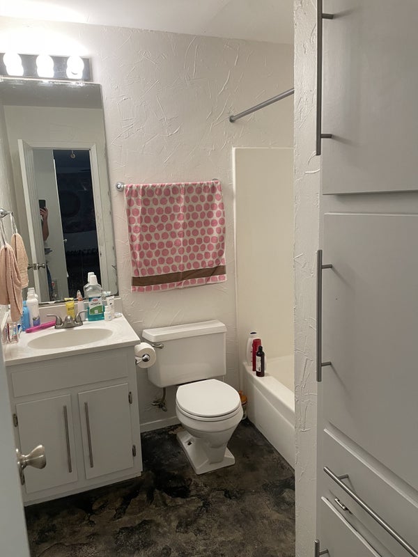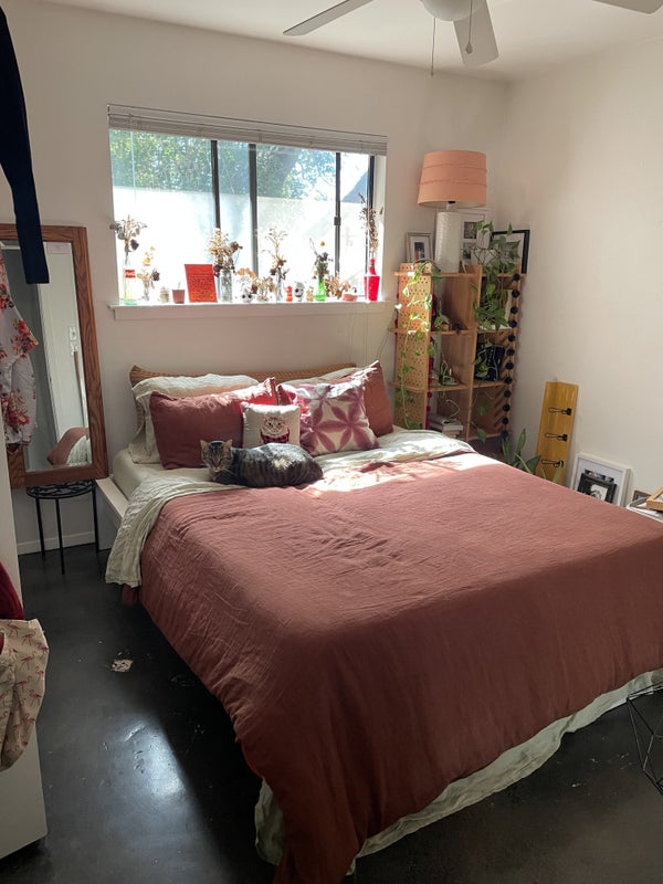 About the duplex: It's a renovated 1980's 2/2 duplex with concrete floors. The neighborhood is relaxed and quiet. The yard is a side yard with lots of plants with a small hangout area under a tree. There's a parking lot in front of the duplex with room for 3 cars. The bedroom is 10'x 10.5'. The bathroom for that room is right outside the bedroom door. You will have your own bathroom. The kitchen is on the smaller side with a dishwasher. There is a W/D in the laundry room. Central AC and heat. I have internet through ATT. No cable. The landlord lives in the unit behind mine. He's a great guy and if anything ever needs work, he's on top of it.