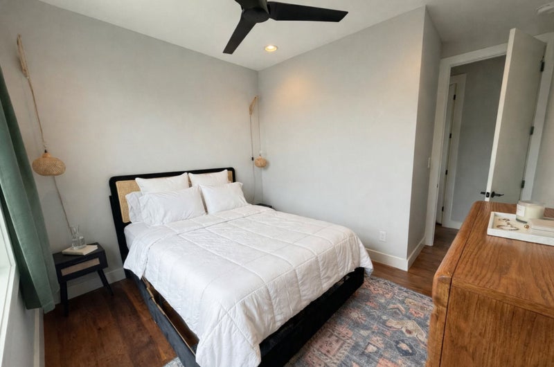 The room comes fully furnished on the second floor with a queen memory foam mattress, large closets, dresser, nightstands, and lamps, and a desk to work from home. A large windows face south and east with vaulted ceilings.