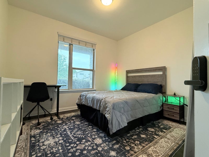 This 1 bedroom in a modern, natural light filled house features 5 bedrooms and 3 bathrooms, offering a total of 2,250 square feet of living space. The kitchen includes stainless steel appliances, a large pantry and plenty of cabinet storage. A front and rear patio are available to enjoy your morning coffee or workout (or both!). Multiple spacious bedrooms to choose from, all designed to accommodate various furniture arrangements. Bathrooms are conveniently on both floors with upgraded fixtures. This home is ideal for those wanting a peaceful retreat while also being within 20 minutes of downtown Austin, airport, Tesla, and other major employers. When not working, this shared living house is a great option if you want to walk with a neighbor to the pool, gym, Drinks Backyard, food trucks, exotic car shows on Saturdays, and the Concourse Project. Utilities and fiber internet are already set up and included for an additional flat fee $100 / month. If interested, reach out with a brief intro and move-in timeline. Don’t miss out on this incredibly convenient living arrangement! Contact for free on Roomies