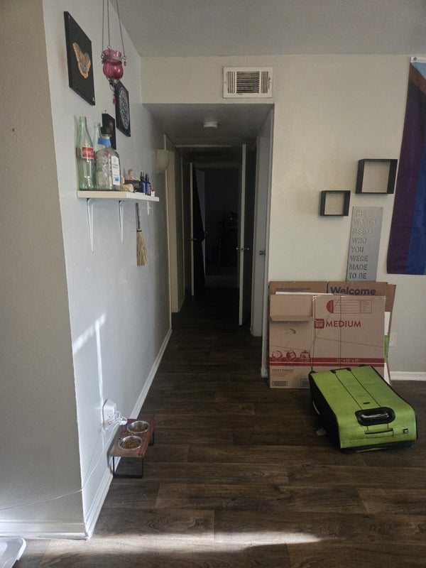 RENT SHOWN INCLUDES UTILITIES (based off of what electricity and water ends up being it might be less). Looking for someone Lgbtq+ or an ally as I am trans. I have a small kitchen but it works. It has a lot of storage space, fridge, oven, stove, and a microwave. I have a lot of kitchen stuff if you don’t have any. There’s a living room (currently no furniture or tv) and a dining room (currently no furniture). You would get a 12’ x 11’ room with carpet and a 2’ x 4’ closet. There’s a shared full size bathroom across the bedroom with a lot of storage space. I don’t have in unit washer dryer but there is one in the apartment complex. There is a fee of $4 per load.