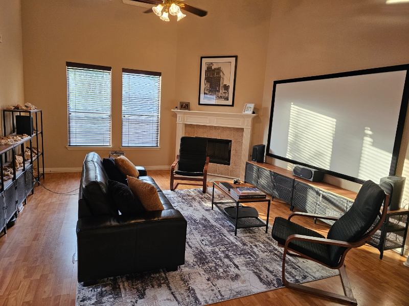 Kitchen full of appliances. Living room with " projector and high quality sound.