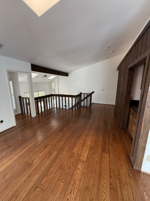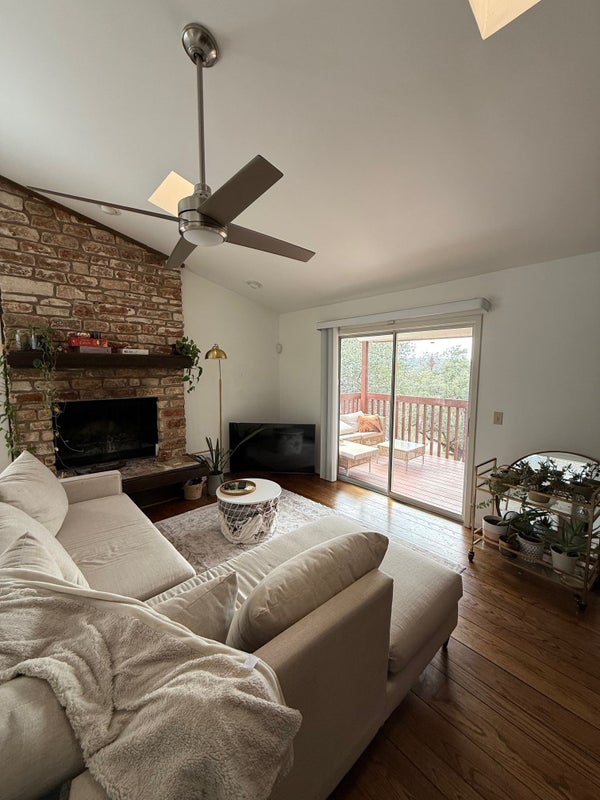 The upstairs features a bright and open floor plan with a large kitchen, dining area, a living room with a wood-burning fireplace, and a balcony. There's also a bonus room with a built-in wet bar—a blank canvas for us to create a cool cocktail lounge, media room, or whatever we envision!