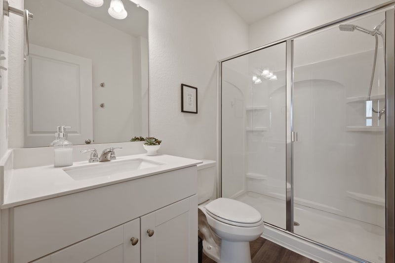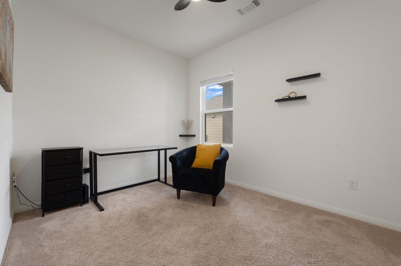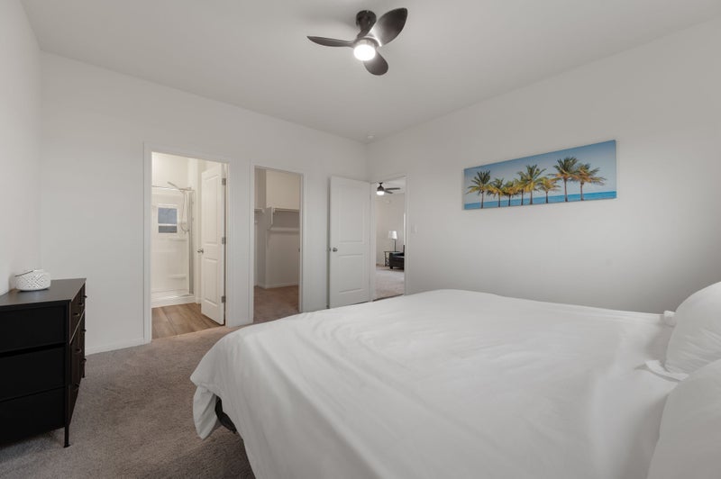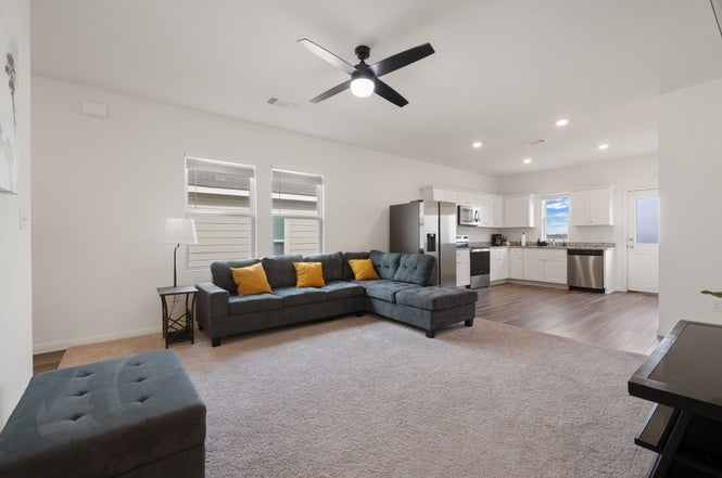 This 1-bedroom, 1-bathroom space within a shared single-family home in Jarrell, TX. The living room features big screen TV and surround sound, providing an ideal environment for relaxation and entertainment. The spacious bedroom includes a personal bathroom, walk-in closet, and ceiling fans. Additional amenities include high-speed internet access, a security system, and in-unit washer/dryer for added convenience. The property has a garage which also provides ample storage space. The exterior is well-maintained, contributing to a pleasant living environment.