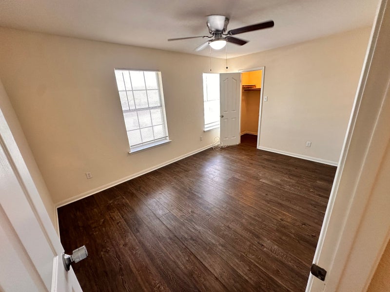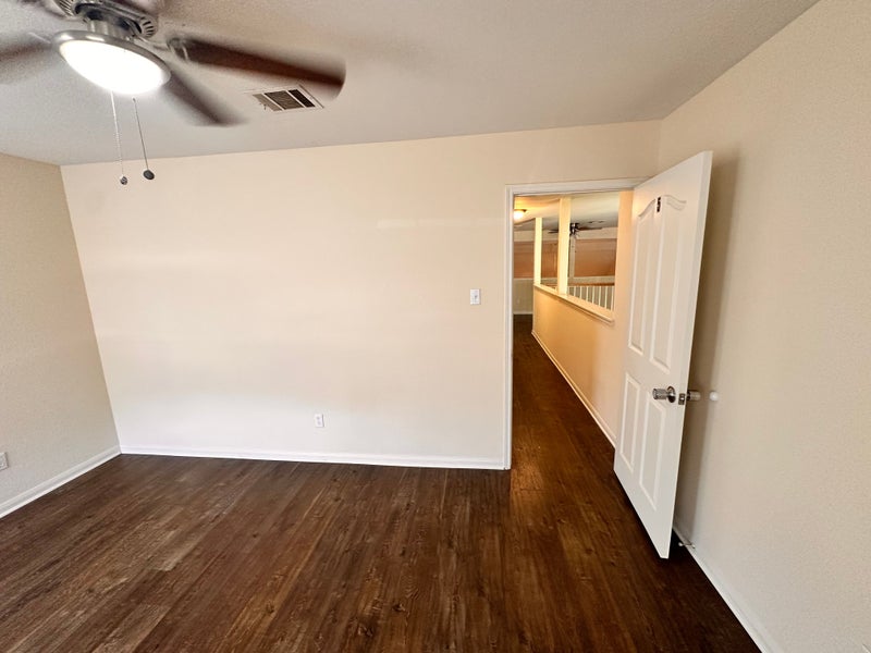 Master down, upstairs has one wing with bedroom, bath and utility room, other wing has 3 bedrooms and bath.