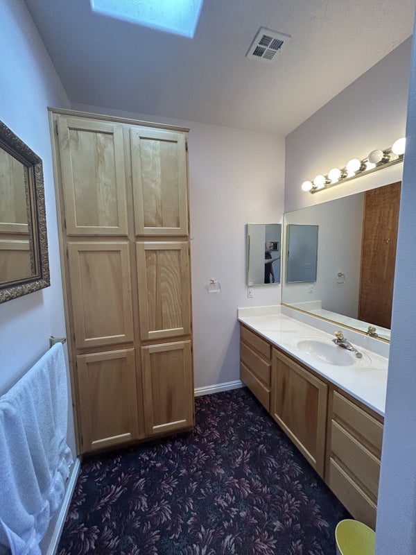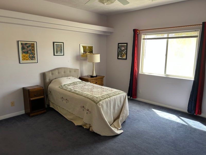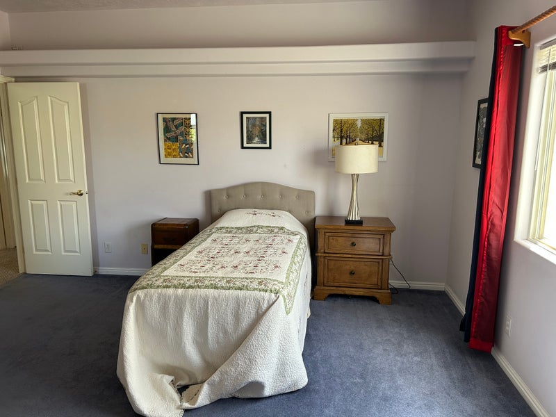 Master bedroom with private bathroom for rent n quiet home. Room has two walk in closets, a twin size bed, two nightstands and a lamp. Bath has jacuzzi tub and large bathroom with more storage. Enjoy the walled in garden and patio with breathtaking mountain views. Full kitchen, laundry room and driveway to park. Cat lives here with me. Looking for a quiet renter.