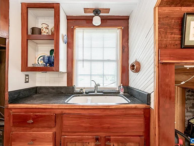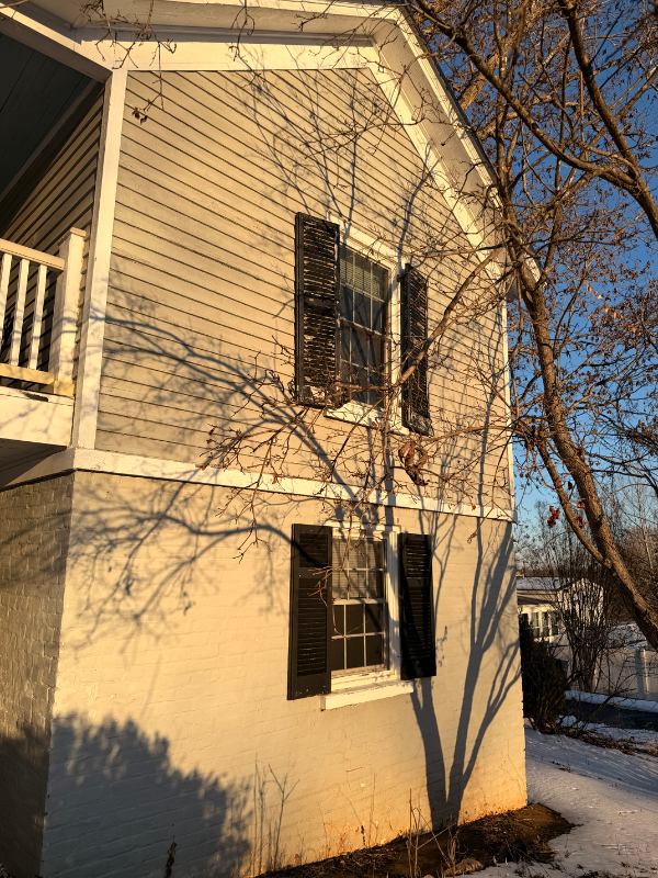 The house has a distinct twolevel structure. The lower level is painted brick, while the upper level features gray clapboard wooden siding and a gabled roof. A secondstory wooden deck extends across the width of the upper level, featuring white balusters and a decorative Xpattern railing section in the center. The windows are flanked by dark black shutters. The upper level has a stained glass window and an exterior light fixture above the deck. The adjoining structure is the main house. Both the main house and the smaller house were built in . The little house used to be the summer kitchen and the servant lived on the top floor. It has been converted into a quaint little cottage with a bedroom and bathroom on the upper floor and a kitchen, washer and dryer area, and a living room on the main floor. It has a door on the upper floor, accessing the deck and a door on the main floor, leaning out back to the parking area.