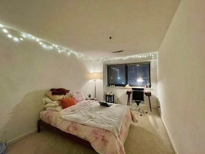The apartment is 1000 sq ft and comes with your own private bedroom, bathroom, and linen closet. The apartment has an in-unit washer and dryer, dishwasher, and central AC/heat. The bed and other furniture may be available for purchase with the room.