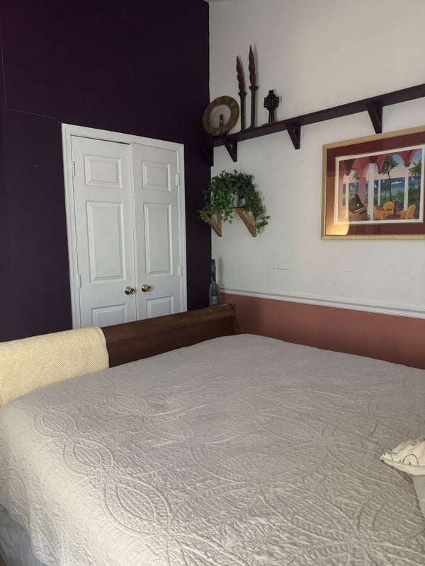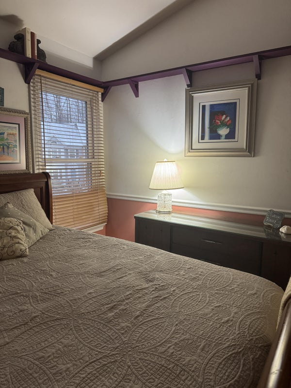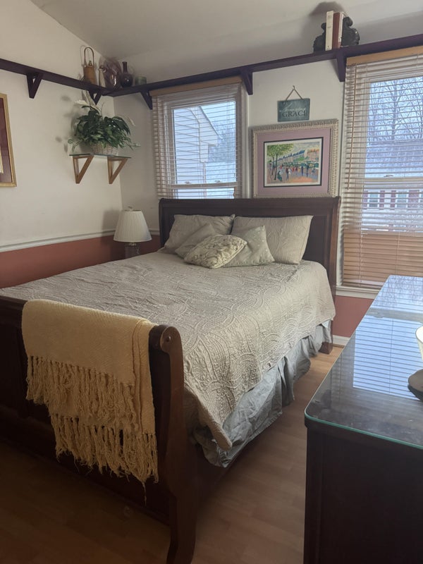 The upper level in our townhome is dedicated to our tenants and we have our private space in the basement. Our first current tenant is an IT professional and works nights 4 days a week. He has been here for over 4 years, if that says anything about the level of peace and comfort you can have here. He is quiet and mainly stays in his room doing computer stuff (don’t ask, I have no idea!). There are two other bedrooms that share a full bath with jacuzzi jetted tub/shower. One room is occupied by a retired male. The remaining room has a queen bed, large flat screen TV, dresser, nightstand and closet. The room has decor items that you can use or add your own as you wish,