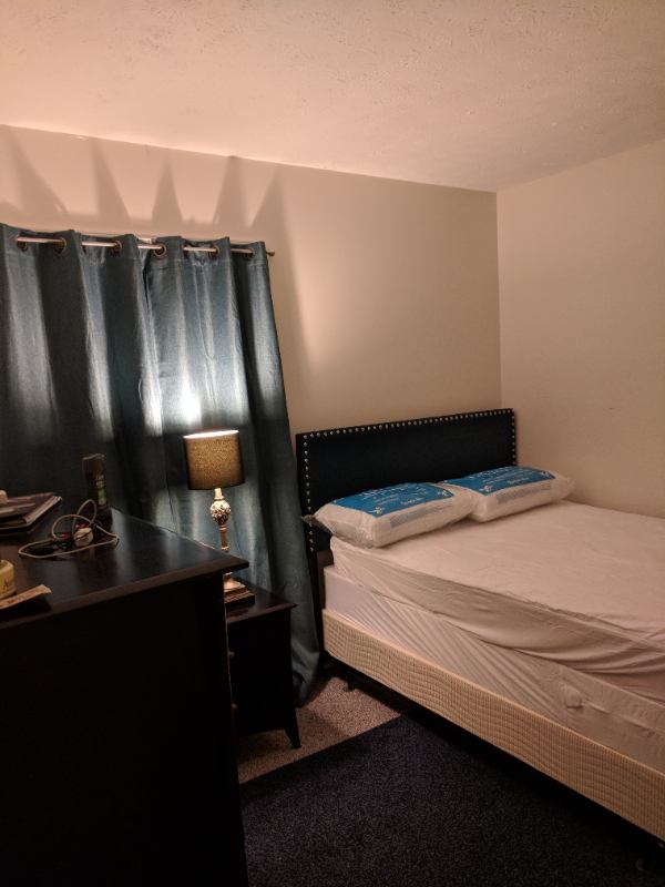 WHAT'S FOR RENT One bedroom in a bedroom, .bath townhouse. Furnished with a full bed, mattress, and box spring. The room also features a dresser, closet, carpet, and a rug. Access to the kitchen, living room, bathrooms, laundry room, and fenced backyard is shared with other tenants.