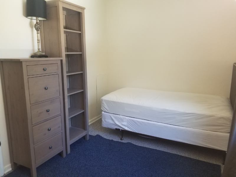 WHAT'S FOR RENT One ' x ' bedroom in a bedroom, .bath townhouse. Furnished with a twin bed, mattress, and box spring. The room also features a dresser, bookcase, closet, carpet, and a rug. Access to the kitchen, living room, bathrooms, laundry room, and fenced backyard is shared with other tenants.