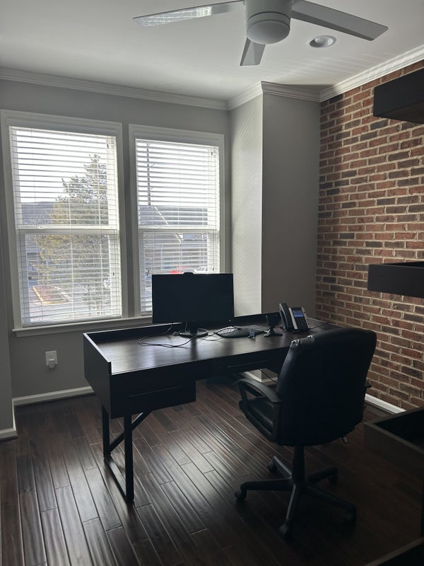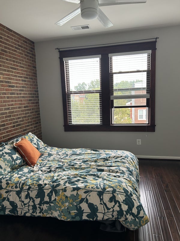 Good size room and closet, sun-drenched with 3 large windows, hardwood floor, brick wall, ceiling fan. Shared bath with double granite vanity with one clean, respectful person. Shared living room, kitchen, office, and laundry in modern home with hardwood and granite throughout. Two minute walk to bars, shops and restaurants in Ild town and 10 minute walk to VRE. Parking included plus plenty of street parking. Available for a , clean, responsible person with a good credit score.
