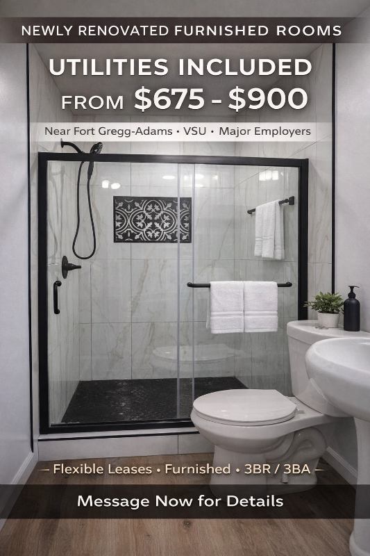 Attention Military Personnel PCSing to Fort GreggAdams (Fort Lee) Looking for a FURNISHED clean, comfortable place to call home? We have the perfect option. Currently under construction. Available April , Just minutes from base Private room single occupant only Private bathroom All utilities included (electric, water, WiFi, etc.) Quiet, professional adult household Flexible shortterm or longterm rental options Close to shopping, dining, and local amenities Ideal for activeduty military males seeking a stressfree move and a hasslefree living arrangement. Contact us today to secure your spot.
