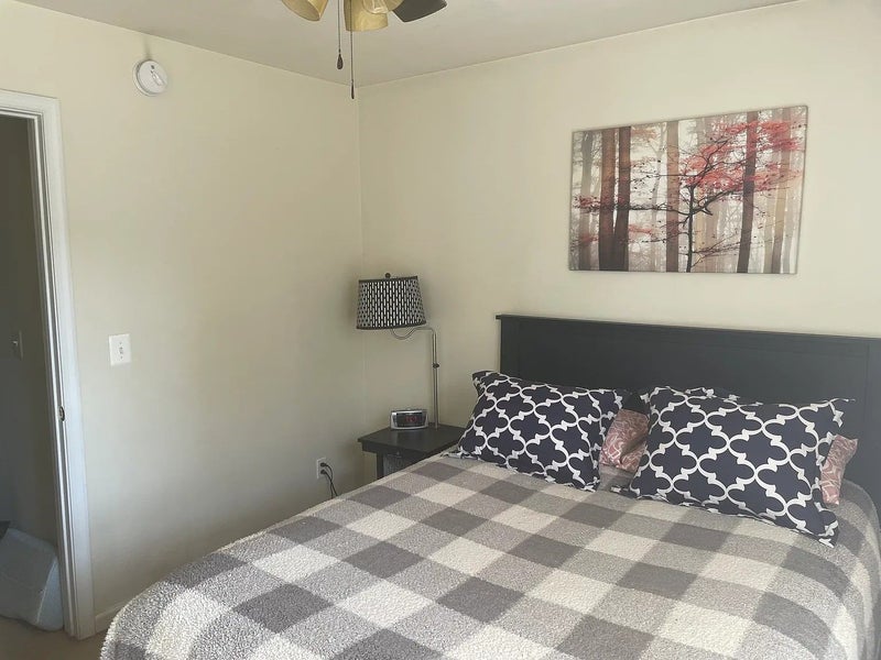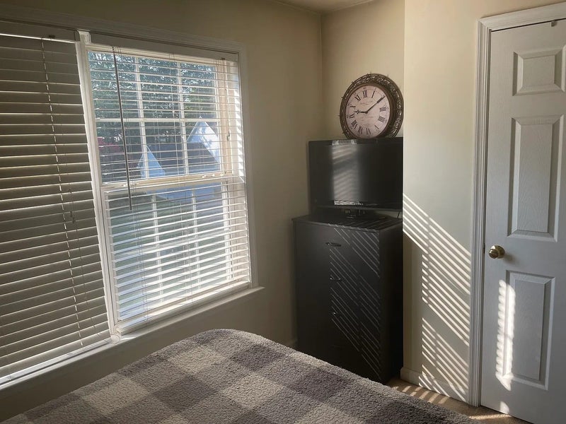 Room is fully furnished, with queen bed and night USB stand along with chest of drawers and closet, also smart TV.