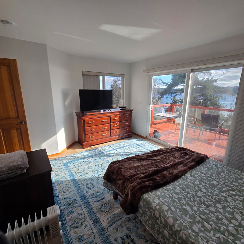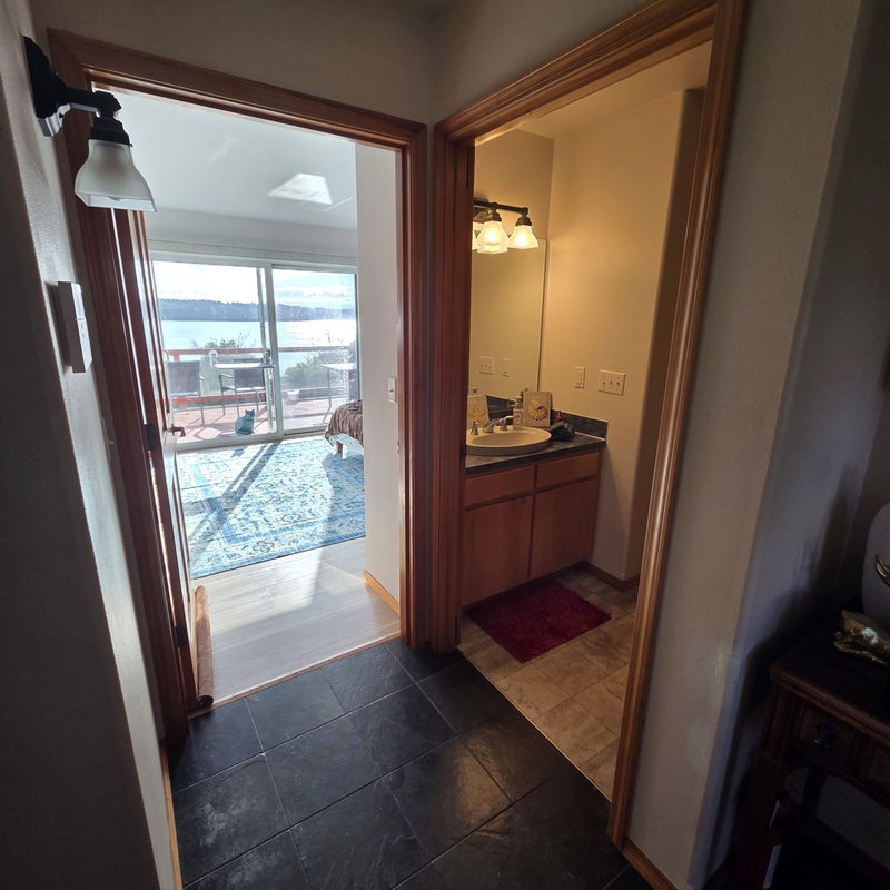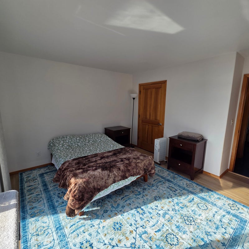 1 bedroom with a private deck and bathroom. The bathroom is just adjacent to the room. Room is furnished and recently updated. House is 3 bedroom/3 bathroom. Use of house kitchen and use of a renters fridge in the garage (next to room). Utilities and internet included. House is located in a quiet and private area. My wife and I rent out the other bedroom downstairs, who is currently deployed. 2 indoor/outdoor cats and 1 other outdoor cat, all friendly.