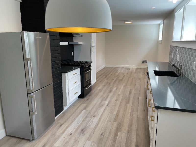 This stylish, recently renovated bdr ba lower level apartment w private entrance boasts tall ft ceilings with lots of daylight. Enjoy a full kitchen wgas range, cozy dining area & living room with TV with FireStick, inunit laundry, and full bath wheated floors. Close to bus, minute walk to lightrail. Street parking.
