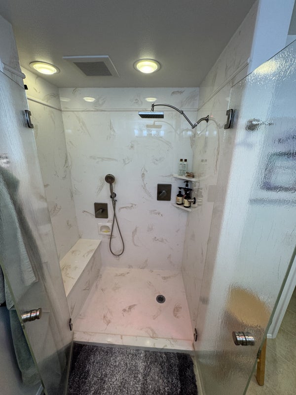 🚿 Upgraded bath: 2 separate sink areas + large walk-in shower with bench (dual shower heads + textured glass French doors, acrylic marble countertops/shower walls, heat lamp)