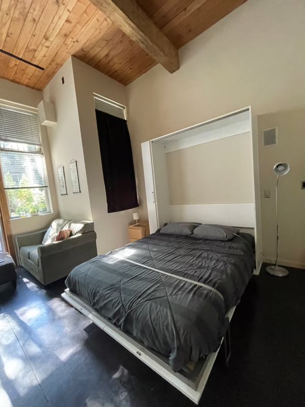 Available May May . & after Aug . Modern CLEAN studio in a beautiful building.Vaulted ceilings, concrete floor, tiled bath, Sliding glass door to patio nicely extends the space. WD in unit. Queen MurphyBed + pullout sofa bed, kitchenette w single burner and a pro Ninja countertop convection ovenairfryertoaster (can bake salmon and cookies), full size fridgefreezer, microwave,Bullet Blender, coffee press etc. Your bedding and towels etc. will always be saniwashed before a movein. Excellent walk score plus multiple public transport options. .miles to lightrail station making it an easy trip to airport. miles or less to multiple seattle hospitals, downtown, Amazon, or easy commute to Microsoft.