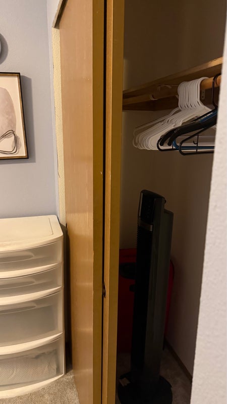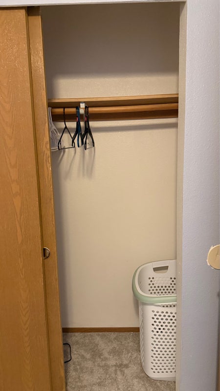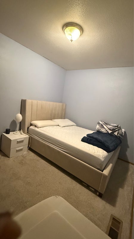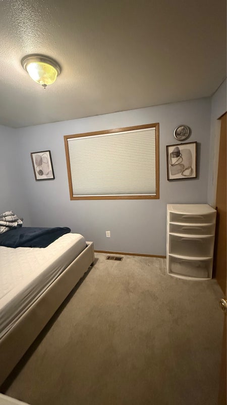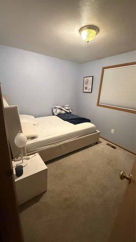 A cozy room available for rent, furnished with a bed, nightstand, and dresser, plus a full closet. You’ll share a full bathroom with one other person, as well as common areas like the kitchen, dining room, and living room.