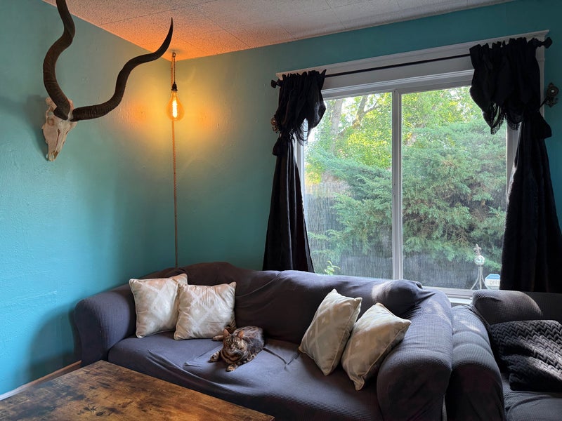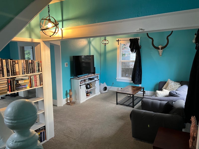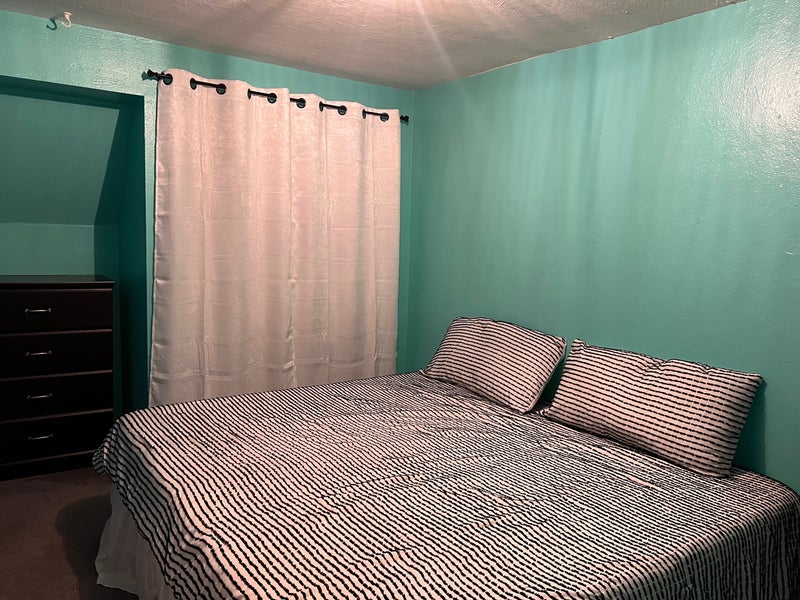 Furnished bedroom available in my two-bedroom house. There is a king-sized bed and a dresser in the room, as well as a large closet. The place is colorful, creative, and very quiet, with a good-sized yard full of trees. There’s extra space in the garden beds if you’re into planting or gardening.